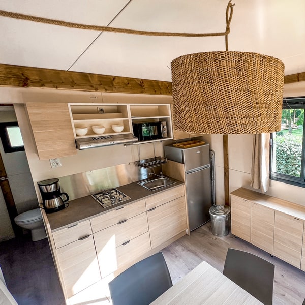Cocon, confortable et tout équipé : ce chalet en bois vous invite à venir profiter en famille de l’ambiance camping, mais avec la petite note douillette en plus ! Profitez également d’une terrasse couverte avec une jolie vue sur la nature (parce que c’est bien plus sympa), idéale pour vos soirées à la belle étoile quelle que soit la saison !